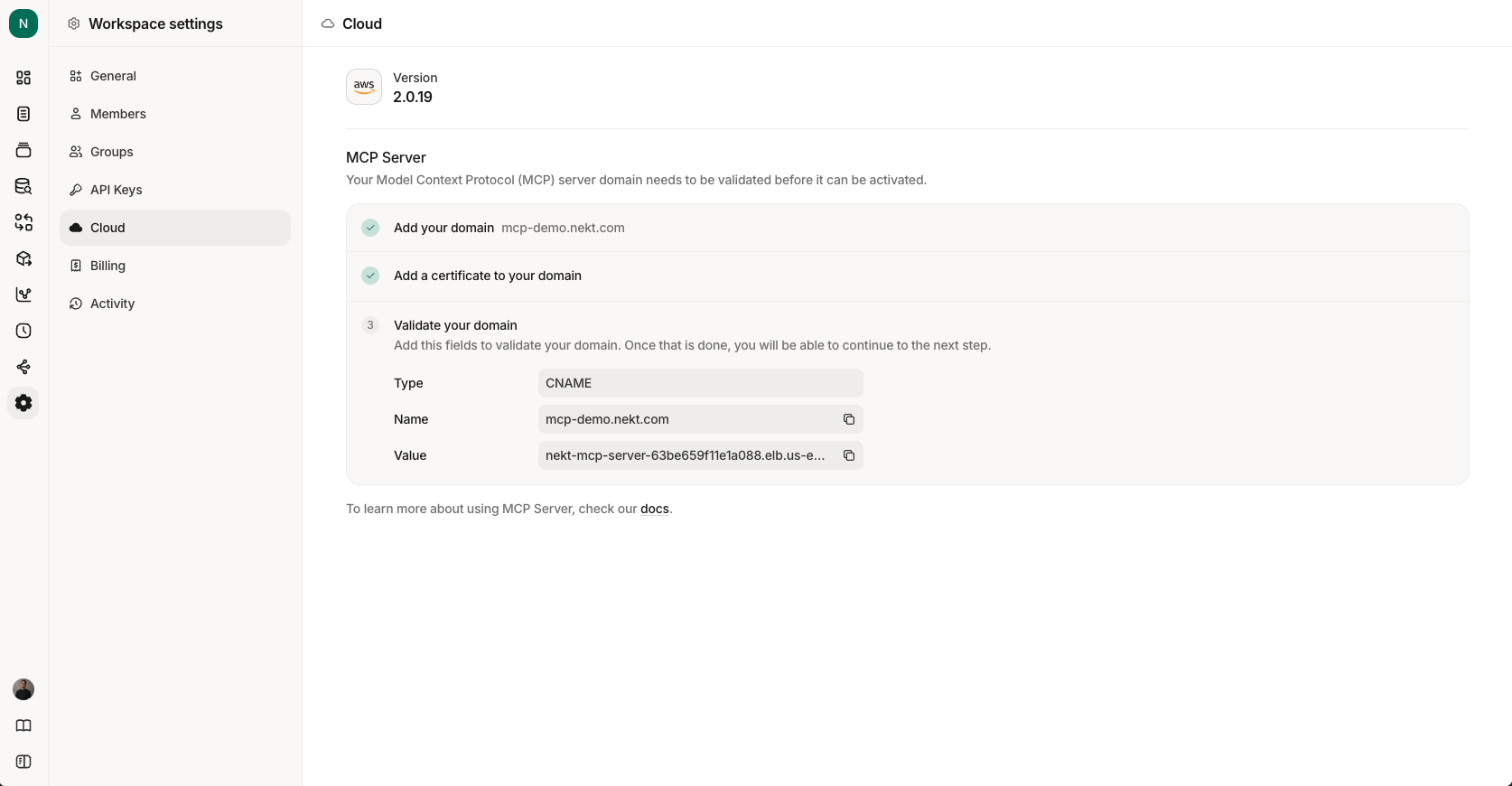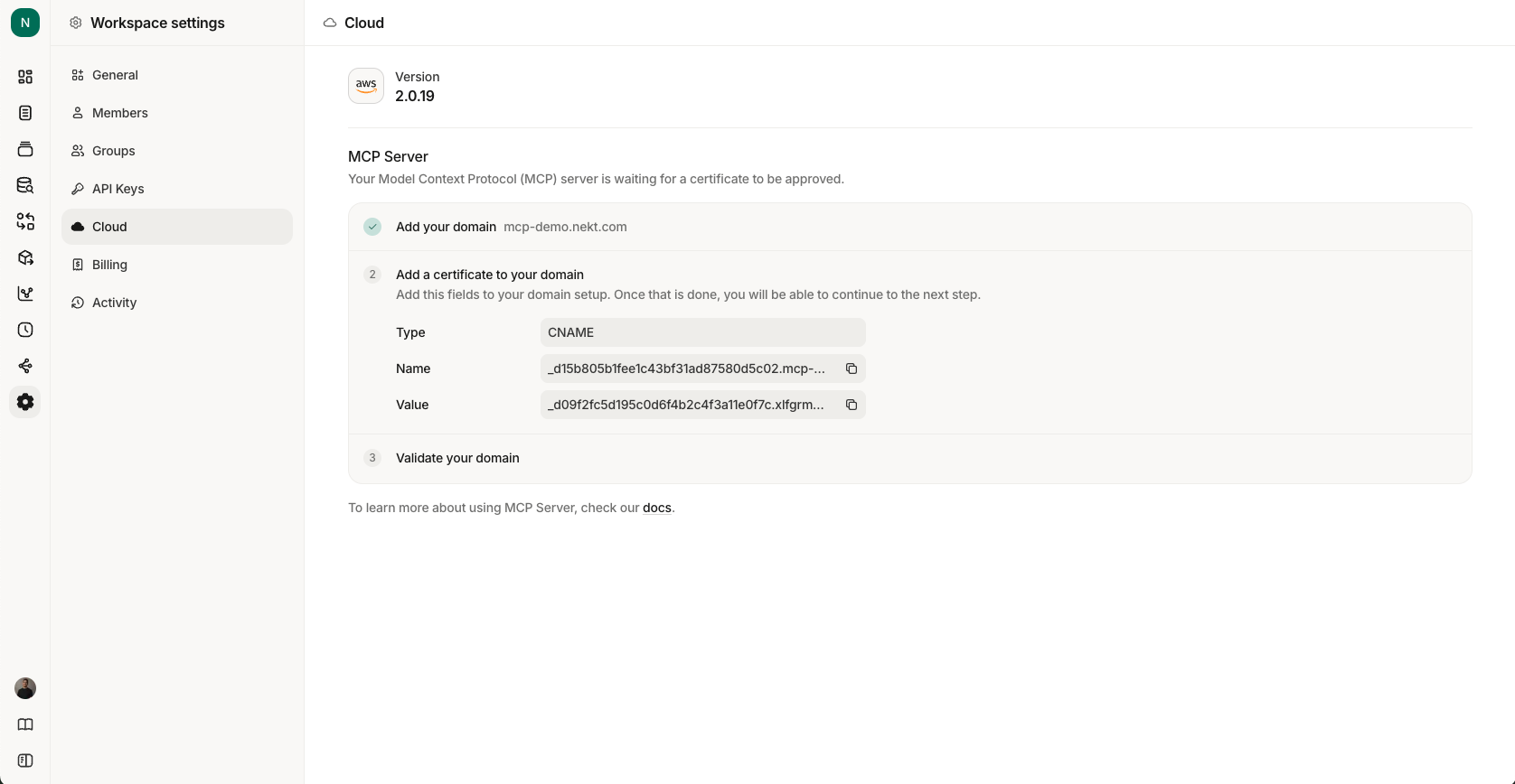 While still in your DNS provider’s dashboard, add the provided CNAME record to point your domain to the new MCP server URL. Please allow an additional 5-10 minutes for verification.