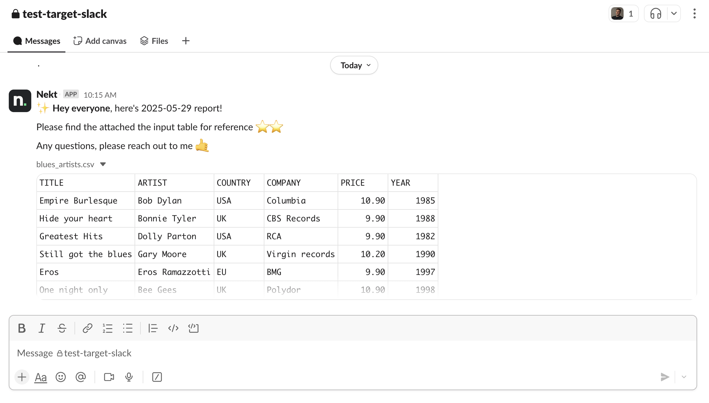 The Slack destination allows you to send data from your catalog directly into a Slack channel of your choice. It allows for automated workflows to share data with your team in a flexible and efficient way. We allow you to customize a message using Slack’s markup language, and sending the input data attached as a CSV file or an image. The result would look like this:
