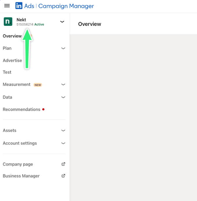 - Account ID: The ID for the LinkedIn Ads account you want to extract data from. This can be found on https://www.linkedin.com/campaignmanagerright below the organization name on the left-side panel.