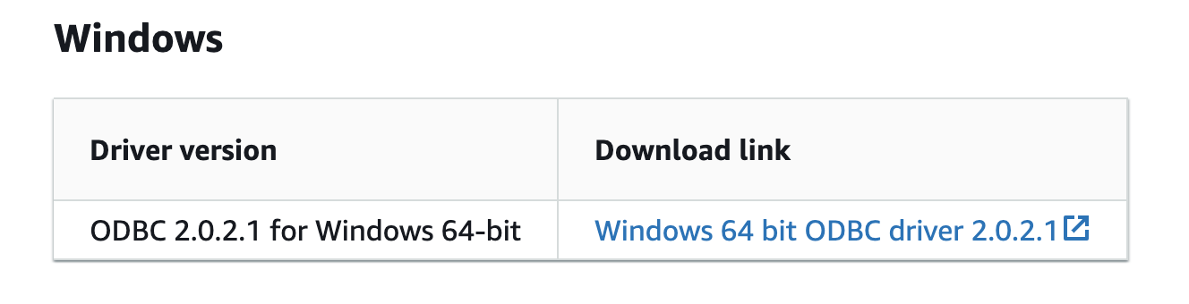 Since the data is in our catalog hosted on AWS, the driver to be used is the Amazon Athena ODBC 2.x. Access https://docs.aws.amazon.com/athena/latest/ug/odbc-v2-driver.html and, in the “Windows” section, click on the driver download link.