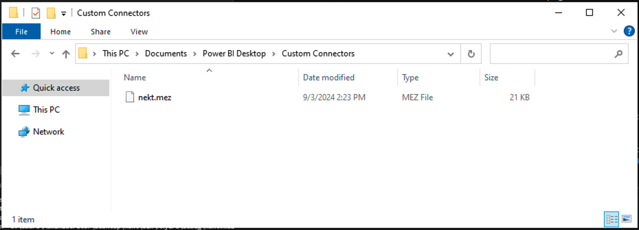 The nekt.mez file is our connector for PowerBI. Please, download it by clicking on this link. As you have the file in your computer, move it to your local [Documents]\Microsoft Power BI Desktop\Custom Connectors folder. If the folder doesn’t exist, create it.Sometimes the folder path might be a little different. Just make sure it is