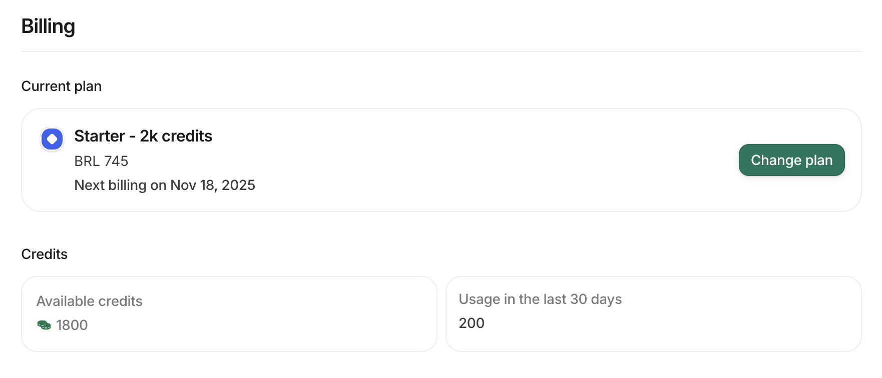 On the Billing section of your workspace, you can check details about your current plan, payment and invoices and also monitor the remaining credits.